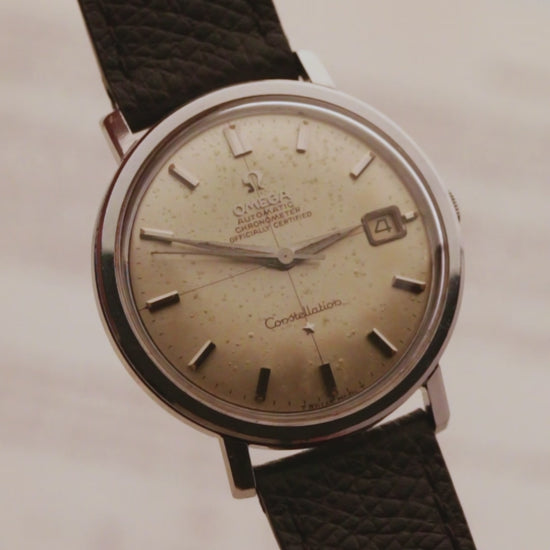 Cette montre est venue pour nous raconter une histoire. Si vous cherchez une pièce parfaite, immaculée, cette montre n'est pas faite pour vous! En revanche si vous cherchez une pièce unique, imparfaitement parfaite présentant un charme certain, vous devriez vous arrêtez quelques minutes sur ce modèle. Cette Omega a traversé le monde, en partant du Japon pour arriver en France. Reçue dans un état esthétique moyen, cette montre avait très certainement une histoire unique à raconter. Son calibre Omega 561 a fait l'objet d'une révision complète en Février 2026 et fonctionne désormais à merveille. Le boitier à fait l'objet d'un ravivage léger, le verre a été changé par une générique. Le cadran d'origine est patiné, légèrement piqué et laisse apparaitre le crosshair très apprécié des collectionneurs. La complication date à 3h est fonctionnelle (pas de date rapide sur ce calibre 561). Les indexes appliqués et facettés sont superbes et jouent avec les reflets de la lumière. La couronne est celle d'origine signée Omega. L'ensemble des points de tritium sont encore présents! Nous avons opté pour un bracelet brun en cuir de lézard de le marque Bouveret pour accompagner cette très belle pièce vintage.